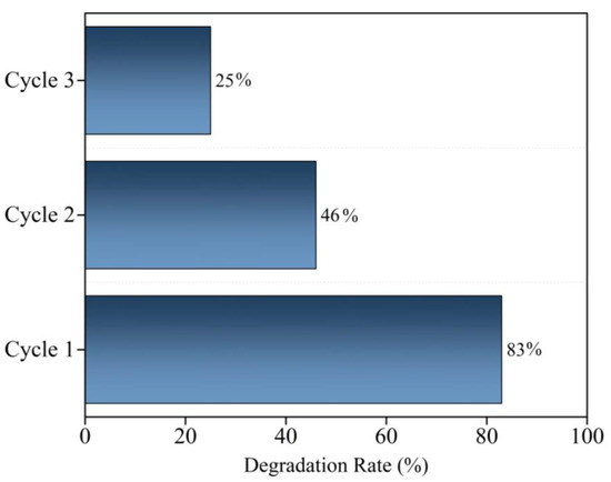 On the other hand, the addition of EDTA (C10H16N2O8) resulted in a 7% decrease in the decolorization rate. These findings suggest that while holes play a partial role in the dye degradation mechanism, hydroxyl radicals (•OH) and superoxide radicals (•O2⁻) are critical to the oxidative degradation pathway facilitated by the TSC500 nanocomposite. To evaluate the reusability of the nanocomposite, reuse tests were performed under the same conditions as the photocatalytic experiments (Figure 8). These tests are essential for evaluating the practical applications of the material. The photocatalyst was subjected to three consecutive cycles, with drying performed after each cycle before starting a new test. The results showed moderate stability, with 46% decolorization of bromocresol green achieved in the second cycle and 25% in the third reuse cycle. The lower decolorization rate in the third cycle is likely attributed to material loss during the process [36,37].