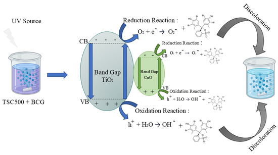 Heterogeneous photocatalysis is a promising method for environmental remediation, relying on semiconductors, light sources, and photochemical reactions at the semiconductor–environment interface [3,4,5]. These reactions generate reactive oxygen species (ROS), which are critical for degrading pollutants. Titanium dioxide (TiO2) stands out due to its crystalline structure, high oxidation potential, and excellent electronic mobility, which enhance its photocatalytic efficiency [6]. Similarly, copper oxide (CuO) offers complementary properties, such as a narrow band gap, robust electrochemical activity, and high stability in various environments [7].