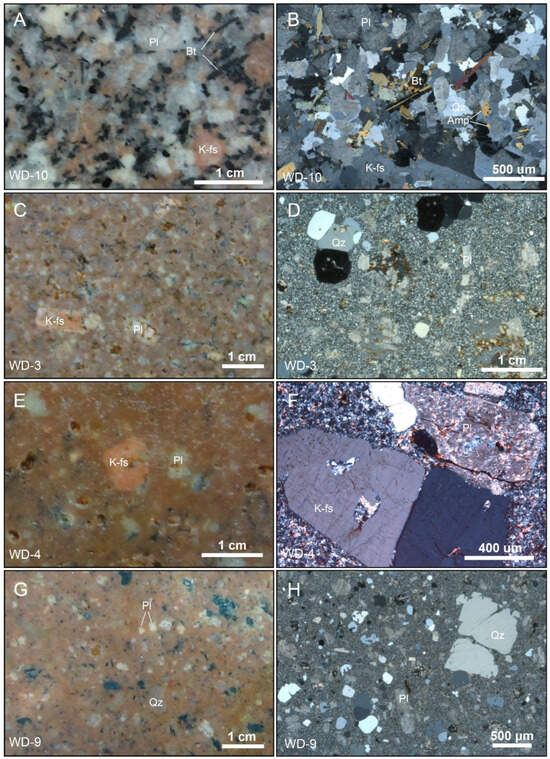 Photos of the Weideshan quartz monzonite (A,B) and granite porphyry (C–H). Abbreviations: Pl = plagioclase; K-fs = K-feldspar; Bt = biotite; Amp = amphibole; Qz = quartz.