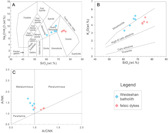(A) Total alkaline vs. silica diagram of the mafic dykes (TAS; [45]); dotted line is the Irvine and Baragar boundary [46] between alkaline and sub-alkaline rocks. (B) K2O vs. SiO2 diagram; boundary lines of different series are from [47]. (C) A/NK–A/CNK diagram.