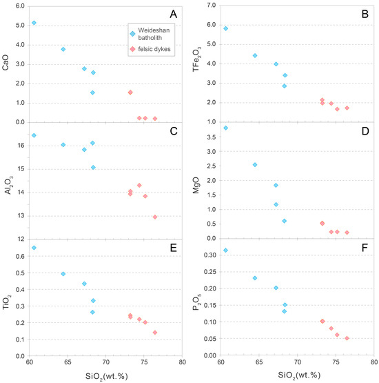 Major elements and their plots against silica. Major element compositions of the Weideshan batholith are from [18].