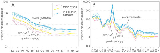 (A) Primitive mantle-normalized REE patterns and spider diagram (B) of quartz monzonite and the felsic dykes. Primitive mantle data are from [48]. Data for quartz monzonite are from [18].