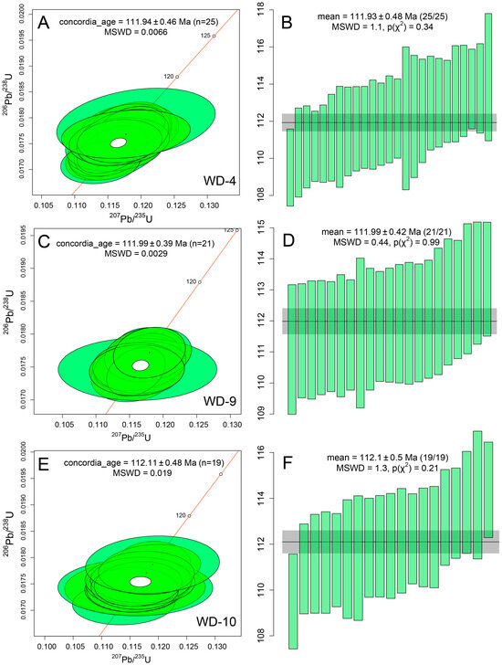 Zircons from two felsic dyke samples and one quartz monzonite sample were analyzed using scanning electron microscopy (SEM). Cathodoluminescence (CL) imaging, LA-ICPMS U-Pb dating, trace element analysis, and Hf isotope results are presented in Supplementary Table S2 and in Figure 7, Figure 8 and Figure 9. Acicular apatite inclusions in zircons are common in all samples. Aside from these inclusions, the zircons are generally clear, lacking xenocrysts or inherited cores. Zircons from felsic dyke samples WD-4 and WD-9 are euhedral, with lengths of 100–200 μm and widths of approximately 50–100 μm (Figure 8). Nearly all zircons display oscillatory zoning in their outer rims, a feature typical of magmatic zircons [49]. Zircons 91500 and GJ-1 were used as primary and secondary reference materials, respectively. Multiple groups of 10 to 12 unknown samples were bracketed based on triplets of primary and secondary zircon standards. NIST610 and 91Zr were used to calibrate the trace element concentrations as an external reference material and an internal standard, respectively. The iolite software package was used for data reduction [50]. Twenty-five analyses from sample WD-4 yielded a concordia age of 111.9 ± 0.5 Ma and a weighted mean 238U-206Pb age of 111.9 ± 0.5 Ma (Figure 7A,B). The U content of the zircons ranges from 272 to 1728 ppm, with an average of 887 ppm (Supplementary Table S2). Thorium concentrations range from 236 to 1220 ppm, resulting in Th/U ratios between 0.52 and 1.09. Twenty-one analyses yielded a concordia age of 112.0 ± 0.4 Ma and a weighted mean 238U-206Pb age of 112.0 ± 0.4 Ma for sample WD-9. U concentrations range from 200 to 1644 ppm, while Th contents range from 117 to 1297 ppm, yielding Th/U ratios similar to the that of sample WD-4 (0.48–1.42). Zircons from the quartz monzonite have oscillatory zoning as well and lack inherent cores. Nineteen analyses yielded a concordia age of 112.1 ± 0.5 Ma and a weighted mean 238U-206Pb age of 112.1 ± 0.5 Ma. The Th/U ratios in these zircons are between 0.71 and 1.20.