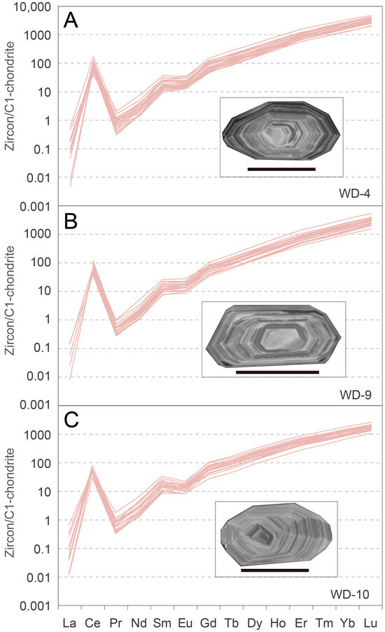C1-chondrite-normalized zircon REE pattern of the felsic dyke (A,B) and quartz monzonite samples (C). C1-chondrite data are from [48]. Inset pictures are CL images of the representative zircons. The scale bars are 100 μm in length.