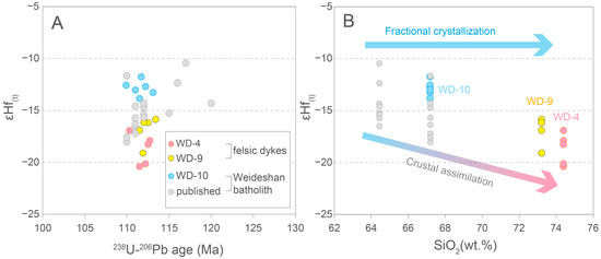 (A) Zircon εHf(t) and 38U-206Pb age plot. Published zircon εHf(t) data are from [18]. (B) Zircon εHf(t) vs. whole-rock SiO2 content plot. Published whole-rock SiO2 contents of quartz monzonite and zircon Hf isotope data (gray circles) are from [18]. Note that there is a decreasing trend in εHf(t) values with increasing SiO2 contents in the different rocks.