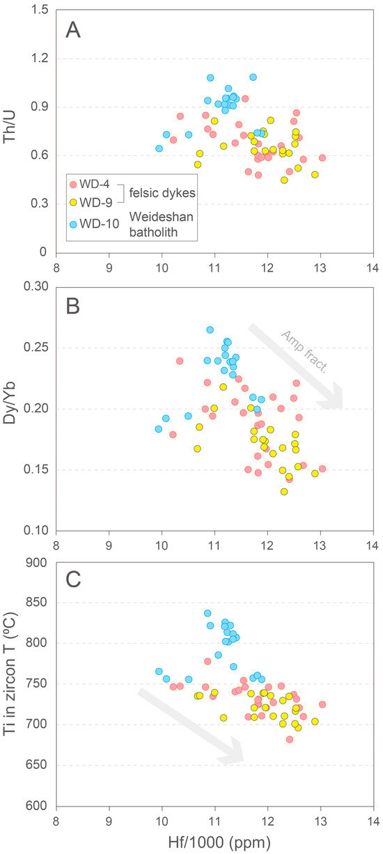 The high Th/U ratios and oscillatory zoning patterns in zircon indicate its magmatic origins in both the felsic dykes and quartz monzonite. Despite close U-Pb zircon ages between the felsic dykes and the quartz monzonite, evidence including the Th/U and Dy/Yb ratio variations and Hf isotopic data suggests that they are distinct. This implies a short interval between emplacement events.
