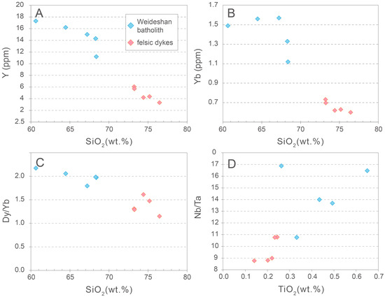 Yttrium and Yb vs. SiO2 plots (A,B), Dy/Yb vs. SiO2 plot (C), and Nb/Ta vs. TiO2 plots (D) for the Weideshan quartz monzonite and felsic dykes. Data source is the same as that in Figure 9.