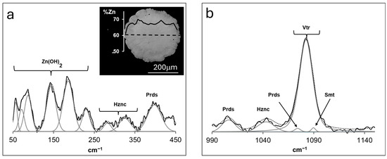 Representative Raman spectra of solids obtained in experiments 1 and 2, relative to the shift intervals (a) 50 < cm−1 < 450 and (b) 990 < cm−1 < 1140. The inset in (a) depicts a BSE micrograph of a grown solid polished section, with the corresponding Zn% compositional profile measured with EMP. Hznc = Hydrozincite; Prds = Parádsasvárite; Vtr = Vaterite; Smt = Smithsonite.