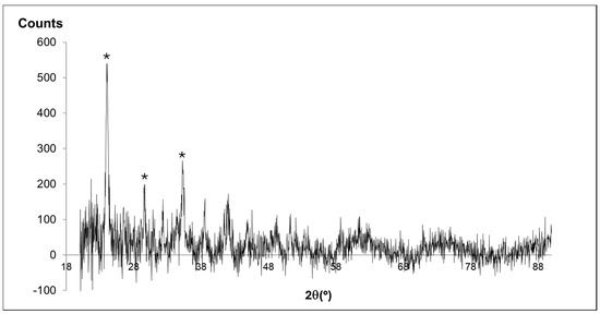 Representative micro-X-ray diffraction pattern obtained in a solid grown in experiments 1 and 2. The * marks reflections assignable to parádsasvárite [22]. Negative intensity values are an artifact of background noise removal, without which, pattern interpretation was not possible.