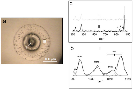 Figure 7 illustrates the Raman spectral information acquired on a representative calcite crystal (Figure 7b) and its overgrown phase (Figure 7c). The spectrum displayed in Figure 7b reveals a set of bands in excellent agreement with the reference data regarding calcite at 158, 285, 715, and 1089 cm−1 (e.g., [29,30]), with ~36 and 0.4% of Ca and Zn, respectively. The spectrum of the overgrown phase, shown in Figure 7c, reveals a set of bands at ~160, 195, 716, 734, and 1091 cm−1 in good agreement with the reference information regarding the vibrational modes of the smithsonite structure [24]. An intense peak occurred at ~285 cm−1, which could be assigned to Zn-O vibrations in the hydrozincite lattice [24], and the very-low-intensity bands at 1006 and 1043 cm−1 correlated with the ν1 (CO32−) symmetric stretching in parádsasvárite [22] and hydrozincite, respectively. EMP measurements indicated that this smithsonite phase was characterized by ~59% Zn and 2.5% Ca. However, calcium analyte from across the phase boundary most likely interfered with the assessment since the area of analysis was near the EMP´s resolution limit.