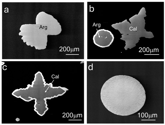 BSE micrographs of representative solids grown in experiments 4–9: (a) aragonite (Arg); (b) calcite (Cal) and aragonite with an overgrowth; (c) calcite with an overgrowth; and (d) Zn hydroxyl carbonate.