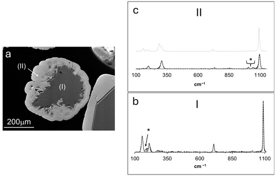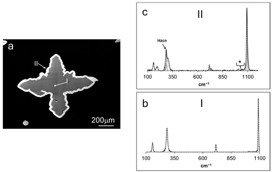 (a) BSE micrograph of a cross-sectioned overgrown aragonite crystal, representative of those grown in experiments 10–15. The Raman spectra of each grown phase (I and II) are displayed in (b,c). The spectrum of smithsonite obtained in experiments at higher supersaturation with respect to Zn carbonates (Figure 7c) is displayed in (c). * Bands not assigned to aragonite or smithsonite, see text for explanation.