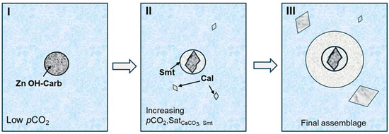 Schematic growth sequence of the multi-phase spherule analyzed in Figure 5a. See text for explanation. Smt = smithsonite, Cal = calcite, Zn OH-Carb = zinc hydroxyl carbonate, Satphase = thermodynamic saturation with respect to the phase in subscript.