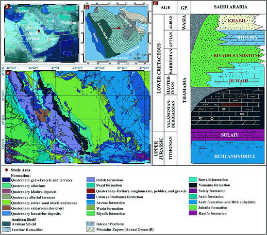 Figure 1. Geology of the Arabian Peninsula. (a) Google Earth image showing the location of the Arabian Peninsula with the studied location marked. (b) Structure and stratigraphic features of the Arabian Peninsula. (c) Geological map of the AR Riyadh Quadrangle (modified after https://ngd.sgs.gov.sa; accessed on 10 October 2024). (d) Jurassic and Cretaceous stratigraphy with notable formations represented in the stratigraphic column.