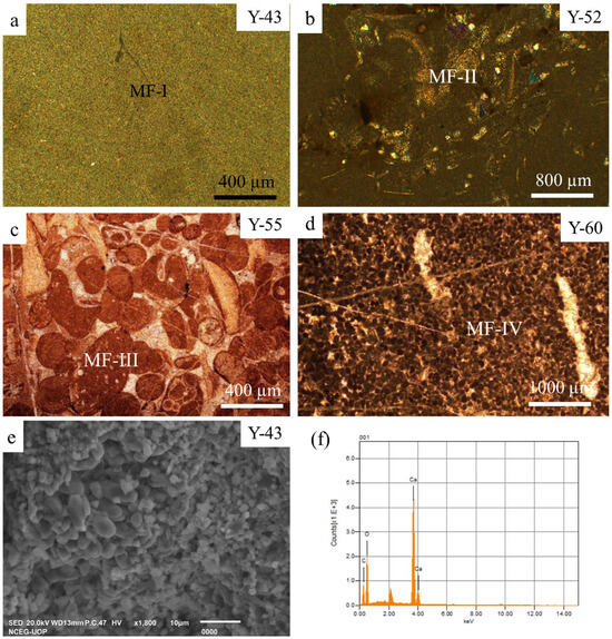 Figure 3. Photomicrographs of the Yamama Formation representing the different microfacies observed. (a) PPL photomicrograph showing mudstone microfacies. Note that there are no bioclasts in this facies. (b) XPL photomicrograph showing wackestone microfacies. Bioclastic shell fragments are visible in the (c) packstone microfacies and (d) grainstone microfacies. (e,f) SEM image of micritic limestone showing granular texture with well-developed crystals and EDS graph showing that the major mineral is calcite.