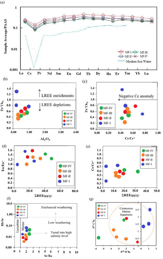Figure 5. Geochemical data of the Yamama Formation. (a) PAAS-normalized rare-earth elemental plot of the carbonates of the Yamama Formation, depicting different microfacies. (b) Plot of (Pr/Yb)N versus Al2O3, depicting the depletion of LREEs in the observed carbonate facies. (c) Plot of (Pr/Yb)N, showing a negative Ce anomaly (d). Plot of ΣREE (µg/g) versus Eu/Eu*. (e) Plot of ΣREE (µg/g) versus Ce/Ce* content (f). Plot of Sr/Ba versus Rb/Sr content, representing the weathering trend of the studied microfacies. (g) Cross-plot of stable isotopes, showing the majority of microfacies lying in Cretaceous marine signatures.