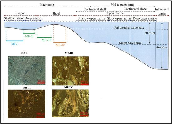 The mudstone facies (MF-I) is composed of lime mud with no fauna, representative of stressed conditions. Such conditions are dominant in lagoonal settings (Figure 3a and Figure 7) [20,21,22,23,24]. The wackestone facies (MF-II) is composed of mud with a low diversity of fauna, which represents low-energy conditions (Figure 3b and Figure 7) [20,21,22,23,24]. The packstone facies (MF-III) are dominated by peloids, bioclasts, and micrite matrices. Such conditions represent moderate-energy conditions (Figure 3c and Figure 7) [20,21,22,23,24]. The grainstone facies (MF-IV) mostly represents high-energy conditions (Figure 3d and Figure 7) [20,21,22,23,24]. There is a marked difference in the microfacies including fossil assemblages between MF-I and MF-II, representing a change in deposition due to fluctuations from low- to high-energy conditions in the ocean at that time. Similar is the case of samples MF-III to MF-IV, which contrast significantly with MF-I (Figure 7).
