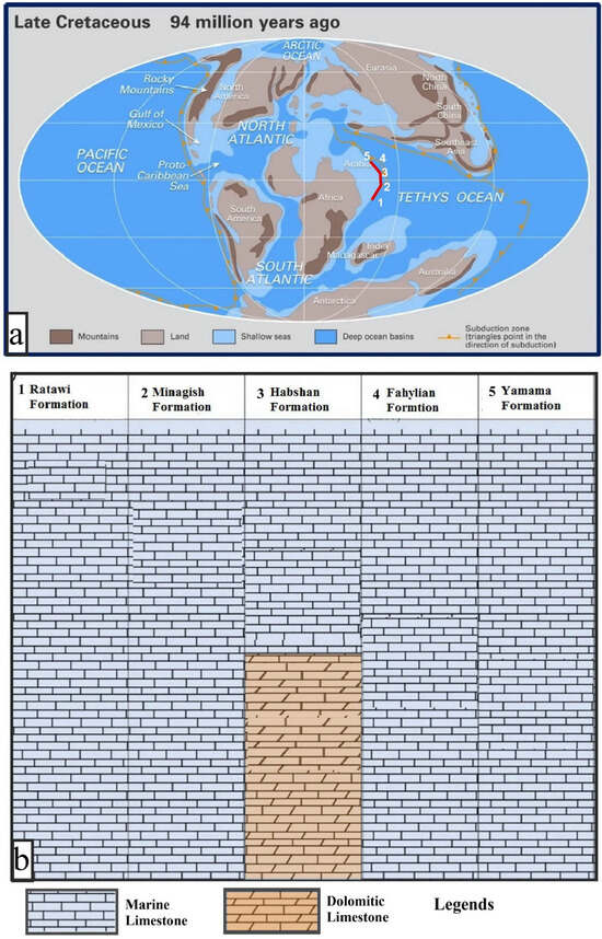 Figure 8. Regional comparison of the Yamama Formation with time-equivalent limestone sequences of the Arabian plate. (a) Paleomap of the Late Cretaceous period (plaoemap.com). Numbers 1–5 along the red line represent the possible paleogeographic locations of the time-equivalent formations. (b). Lithostratigraphic time-equivalent units of the Arabian plate.