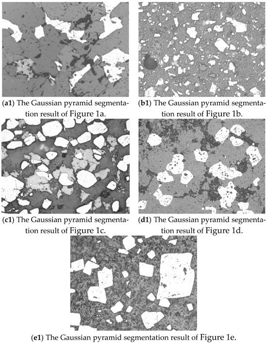 These five images are segmented using image segmentation based on bilateral filtering Gaussian pyramid minerals, and the segmentation results are shown in Figure 2a1–e1.