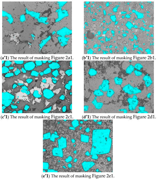 Comparing Figure 1a–e, and the results after segmentation using the bilateral filtering Gaussian pyramid algorithm, it can be seen that it has an excellent effect in preserving mineral edges and grain integrity. The obtained results are converted into pseudo-color images with masks, and the specific results are shown in Figure 3.