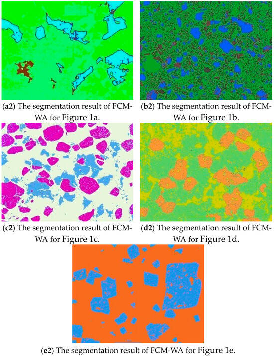 (a), (b), (c), (d), and (e) use the mineral image segmentation results based on the FCM-WA algorithm to correspond to the results (a2), (b2), (c2), (d2) and (e2), respectively.