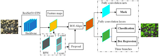 In 2017, the Facebook AI research team proposed Mask-R-CNN, which solved the problem of low segmentation accuracy in some previous deep learning algorithms by combining detection and segmentation to improve the segmentation accuracy of images. Mask-R-CNN is mainly composed of Backbone network, Region Proposal Network (RPN), ROIAlign, classification, bounding box regression and Segmentation Mask Branch. Backbone network is used to extract features from the bottom layer to the top layer of the input image. After the input image is processed by multiple convolutional layers, a feature map is generated for subsequent Region Proposal Network (RPN) and other branches. The Backbone network used in this article is composed of ResNet50+FPN. Region Proposal Network (RPN) is used to slide and extract regions of different scales from the feature image output by the Backbone network. Subsequently, it can predict the two possibilities (target and non-target classification) contained in each region, and then perform regression operations on the bounding boxes of that region. ROIAlign is used to transform irregular regions into fixed-size feature maps, because the fully connected layer of the neural network requires fixed-size input. In addition, this operation can align the pixels of each region, retaining the spatial information of the image. Classification is the process of sending the ROIAlign processed feature maps into fully connected or convolutional layers, and then the model predicts the category of each region based on the extracted region features. The bounding box is used to accurately adjust the position and size of the target bounding box, and the final border is more in line with the real target. The Segmentation Mask Branch generates a binary mask for each Region Proposal, allowing for precise pixel level contours of the target object and distinguishing between foreground and background [34]. The specific process is shown in Figure 5.