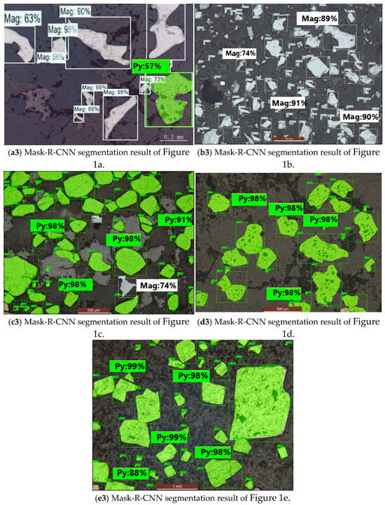 (a), (b), (c), (d), and (e) are the segmentation results using Mask-R-CNN, corresponding to (a3), (b3), (c3), (d3), and (e3), respectively. Among them, Py is pyrite and Mag is lead–zinc ore.