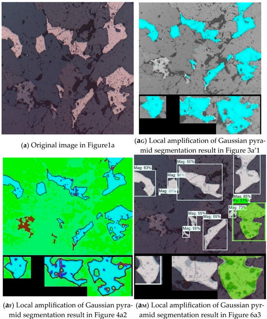 From the segmentation results, Gaussian pyramid with bilateral filtering has the best effect in protecting the edge of mineral particle size contour among the three algorithms. Compared with the deep learning algorithm Mask-R-CNN, the FCM-WA algorithm is more capable of performing better color segmentation on mineral light sheet images. It can effectively segment mineral light sheet images not only in terms of edge preservation but also in terms of mineral classification. As shown in Figure 7aM, the Mask-R-CNN segmentation accuracy is the lowest and does not classify the same type of minerals as the same type of minerals (in aM, the white area and the green area are actually the same type of minerals), which verifies the accuracy of the Dice coefficient.