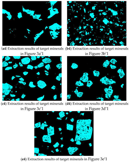 The measurement of mineral grain size under a microscope is crucial, and the segmentation method plays an important role in accuracy. Based on segmentation precision and Dice score, the Gaussian pyramid segmentation method with bilateral filtering performs better for segmenting mineral images. Therefore, this study uses this method to extract embedded metallic minerals from polished thin-section images. The extraction results are shown in Figure 8a4–e4.