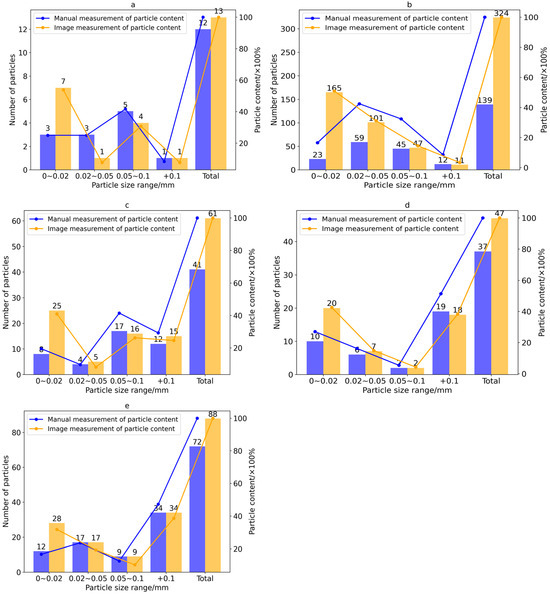 From the data in Table 2 and the trend of the discount graph in Figure 11, we can clearly see that in terms of the number of larger particles (maximum directional intercept greater than 0.02 mm), the results obtained by image measurement and manual measurement in the five metal mineral microscope images in Figure 1a–e are almost the same. In addition, the trend of the discount chart is almost consistent between image measurement and manual measurement. The biggest difference between the results obtained by the two measurement methods is in the area where the intercept of the particle orientation is less than 0.02 mm. Upon reflection, the reason for this is that when measuring small particles, manual measurement cannot measure all particles, as shown in Figure 1b where the metal mineral particles under the microscope exhibit small and complex distributions, making it difficult for manual measurement to measure all particles. Therefore, it is verified that the algorithm proposed in this paper can accurately measure the mineral microscopic images.