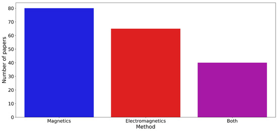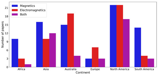 Going into more detail, an histogram of the number of papers by method and continent (Figure 3) shows distinct patterns. Electromagnetic and magnetic paper numbers are the same in North America, while magnetic methods are more popular in other continents except Europe, where EM methods are favored. The combination of magnetic and EM techniques is popular in North America and Asia. Although the number of case studies documented in a particular continent is function of various factors such as the geography and metallogeny, the mining market, the exploration activity, the number of researchers in each continent, and the bias of the scientific journals that were used for this study, it is, therefore, a first-order indication of the preference for each method in these continents.
