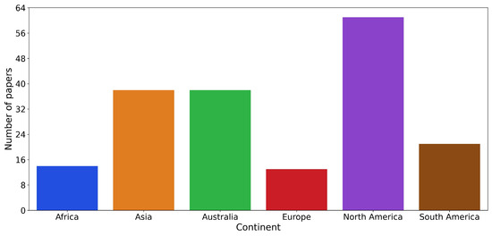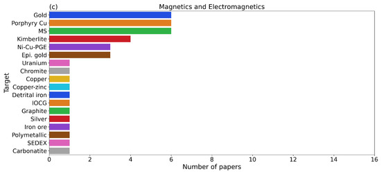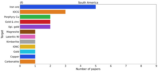 Figure 6 presents the same information by continents. Gold and polymetallic-style mineralization are studied in Africa, while gold, polymetallic, and kimberlite are studied in Asia. In Australia, gold and massive sulfides are studied geophysically, while in Europe, case studies for Ni-Cu-PGE, polymetallic, and graphite are more popular. In North America, studies have been conducted predominantly on uranium, porphyry copper, massive sulfides, gold, kimberlite, and others. In South America, iron ore, IOCG, and porphyry copper mineralizations have been studied.