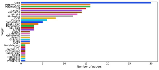The following figures illustrate the distribution of the various deposit types documented. In Figure 4, the total number for each target type is presented. The classification of the deposits was based on the information provided by the authors of the case studies and is sometimes more commercial than geological. However, characteristic features can be observed. Gold mineralizations are the most popular, followed by porphyry copper, polymetallic, massive sulfides, uranium, Ni-Cu-PGE, iron ore, kimberlite, and IOCG.
