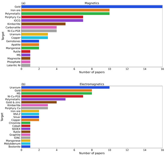In Figure 5, these types of mineralization are classified by methods. Magnetic techniques are favored for gold, iron ore, and polymetallic, while electromagnetic methods are used for uranium, massive sulfides, and gold. Both methods characterize porphyry copper, massive sulfides, and gold.