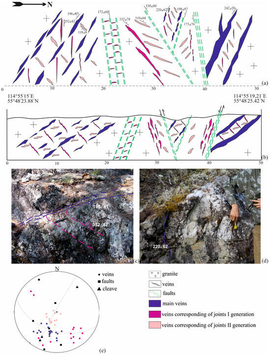 The structure of the vein systems (the Krivoy zone): (a) Plan view; (b) S–N profile; (c) Position of quartz veins in an outcrop; (d) Main vein of the southwestern dipping; (e) Stereographic projection of the distribution of structural elements and veins.