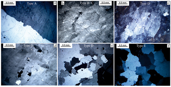 Types of microstructure in vein quartz from Krivoy zone: (a) protogranular; (b) subblock and fragmentary; (c–e) pseudo-porphyroblastic; (f) granular.