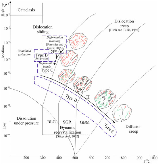 Deformation evolution of vein quartz in a modified chart of quartz deformation mechanisms. Strain rates (in s-1) are along y axis. The sketch illustrates changes in quartz aggregates. Colors show high-angle (black), low-angle (green), and Dauphiné twin (red) boundaries [45]. Mechanisms of dynamic recrystallization by [53,54,55]: BLG—Bulging recrystallization, SGR—subgrain rotation recrystallization, GBM—grain boundary migration. Types of microstructure in vein quartz: A—protogranular, B—sub-block, C—fragmentary, D—pseudo-porphyroblastic, E—granular.