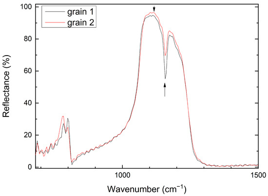 Example of reflection spectra of two grains with different orientations related to incident beam. The arrows indicate the peak at 1118 and the dip at 1160 cm−1.
