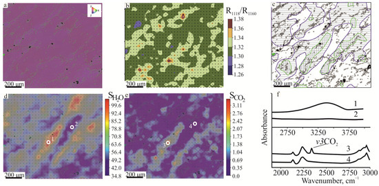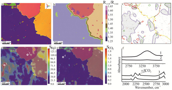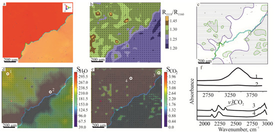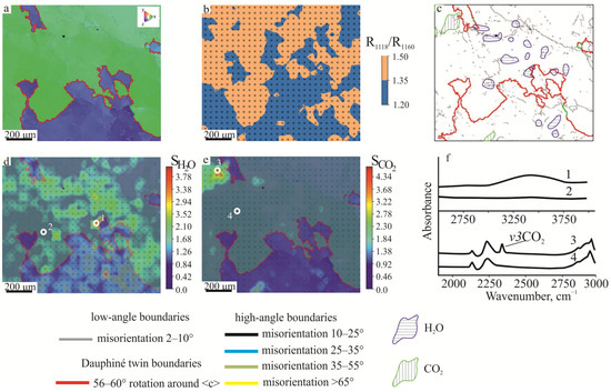 Features of the distribution of water and carbon dioxide in quartz of grain microstructure: (a) the processed EBSD band contrast + inverse pole figure map with the color-coded boundaries; (b) Map of the intensity ratio of peaks 1118 and 1160 cm−1 in the reflection spectrum; (c) Map of the distribution areas of water and carbon dioxide within the selected elements of the microstructure; (d) Map of the distribution of H2O based on the area of peak ~3400 cm−1; (e) Map of the distribution of CO2 based on the area of peak 2350 cm−1; (f) Absorption spectra of H2O and CO2 (the numbers correspond to the regions in (d) and (e)).
