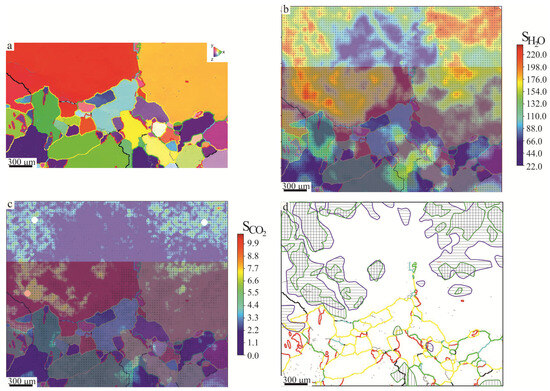 Features of the distribution of water and carbon dioxide in quartz: (a) the processed EBSD band contrast + inverse pole figure map with the color-coded boundaries; (b) Map of the distribution of H2O based on the area of peak ~3400 cm−1; (c) Map of the distribution of CO2 based on the area of peak 2350 cm−1; (d) Map of the distribution areas of water and carbon dioxide within the selected elements of the microstructure.