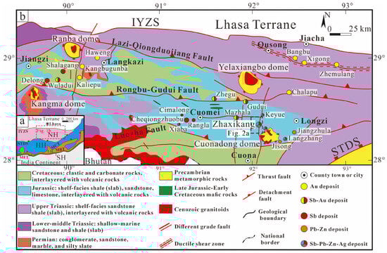 (a) Tectonic framework of the Himalayan terrane (modified after Yin, 2006 []; Wang et al., 2018 []). (b) Regional geological map of the North Himalayan Metallogenic Belt (modified from Zheng et al., 2012 []; Wang et al., 2018 []). (IYZS: the Indus–Yarlung Zangbo suture zone; STDS: the South Tibet detachment system; MCT: the Main Central thrust fault; MBT: the Main Boundary thrust fault; MFT: the Main frontal thrust; NH: the North Himalayan Tethys sedimentary fold belt; HH: the High Himalayan crystalline rock belt; LH: the Low Himalayan fold belt; SH: the Sub-Himalayan tectonic belt).