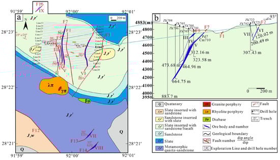 (a) A geological map of the Zhaxikang Pb–Zn–Ag–Sb deposit (modified from Zheng et al., 2012 []; Wang et al., 2017 []). (b) Cross-section map showing the occurrence of orebodies (modified from Wang et al., 2021c []).