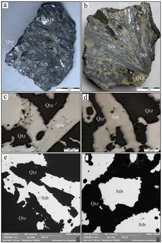 (a,b) Hand specimen photographs of representative stibnite samples from the Zhaxikang deposit. (c,d) Reflected light microphotographs of representative stibnite samples from the Zhaxikang deposit. (e,f) Backscattered electron images (BSE) of representative stibnite samples from the Zhaxikang deposit (Stb = stibnite; Qtz = quartz).