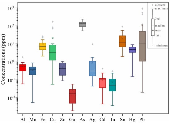 Stibnite that intergrows with quartz shows typical radiating aggregates of elongated, prismatic, and four-sided crystals with pyramidal edges (Figure 4c–f). The proportions of trace elements within stibnite in the Zhaxikang deposit appear as: As ≥ Pb ≥ Sn ≥ Fe ≥ Cu ≥ Hg ≥ Ag ≥ Zn ≥ Al ≥ Mn ≥ Cd ≥ In ≥ Ga (Table 1 and Figure 5). The majority of the measured elements had concentrations lower than the detection limits. Therefore, only the 13 elements aforementioned with concentrations significantly above the detection limit are suitable for further analysis. Arsenic shows the highest concentrations, spanning between ~53 and ~240 ppm. The second abundant element is Pb, which shows erratic distribution ranging from ~0.5 to ~110 ppm, while the concentrations of Fe, Cu, Hg, and Sn are relatively low, ranging from 1 to 30 ppm. The concentrations of Al, Mn, Zn, Cd, Ag, and In range commonly from 0.01 to 1 ppm. The gallium concentration is the lowest, which is lower than 0.1 ppm or even under the detection limit. Some of the analyses show anomalous concentrations even though we have tried to avoid visible inclusions. The latter is attributed to the possible presence of micro-inclusions.