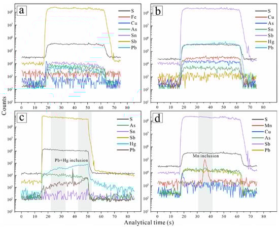 Representative single-spot LA-ICP-MS depth profiles of selected trace elements in stibnite from the Zhaxikang deposit. (a,b) even depth profile; (c,d) sharp depth profile.