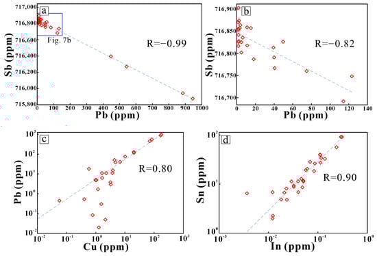 Correlation scatter plots of (a) Pb vs. Sb; (b) Pb vs. Sb (with outliers deleted); (c) Cu vs. Pb; and (d) In vs. Sn of stibnite from the Zhaxikang deposit.
