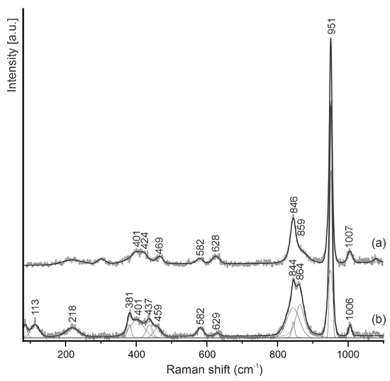 The Raman spectra of V-low silicocarnotite (V2O5 ≤ 1wt. %) exhibit the following bands (cm−1) (Figure 3a): 1007 ν1(SO4), 951 ν1(PO4), 846 ν1(SiO4), 628 ν4(PO4), 582 ν4(SiO4), 469 and 397 ν2(PO4) and ν2(SiO4), 218 ν(Ca-O) ([23,24,25,26]. The strongest bands reflect the vibrations of (SiO4) and (PO4) tetrahedra. The V-bearing spectrum of silicocarnotite (Figure 3b) shows an additional line at 864 cm−1 corresponding to the ν1(VO4)3- vibrations and partially overlapping with the ν3(SiO4)4- line [26].