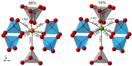 The positions of Ca1 and Ca1A are symmetrically located between four tetrahedra T2, which are filled with P and Si = 50/50. Considering that the local charge balance determines the need to fill two tetrahedra with Si and the other two with P, we can assume that the phenomenon of the splitting of the Ca1 position is related to the partial ordering of Si and P in the T2 tetrahedrons; for example, the two upper T2 tetrahedra (if we look at Figure 5) are occupied by P and the two lower ones by Si.