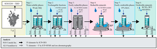 Five subsamples from core P4 were sent to SGS Canada Inc. (Lakefield, ON, Canada) for a seven-step sequential extraction, following the methodology of [35]; see Figure 2 for details. This procedure aim to extract: (1) water-soluble phases, (2) exchangeable phases, (3) easily reducible phases/minerals (e.g., Fe and Mn oxyhydroxides) and oxalate-extractable phases (e.g., Al oxyhydroxides), (4) reducible minerals (e.g., magnetite), (5) easily oxidizable phases/minerals (e.g., secondary sulfides), (6) resistant oxidizable minerals (e.g., primary sulfides) and (7) residues and silicates. The same sample was used during all steps; hence, the residual solid phase from one step was used in the next step.