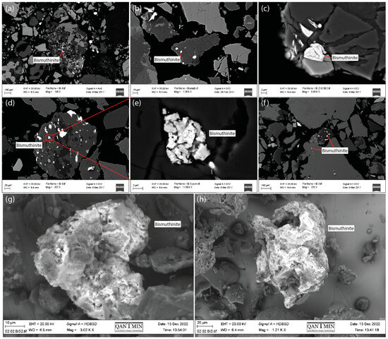 Bismuthinite (Bi2S3) in the P4 tailings profile was observed mainly as small inclusions in silicate minerals (a–f). In the shore tailings, weathered bismuthinite was observed in three dimensions (g,h).